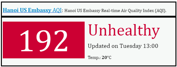 Theo dữ liệu của Đại sứ quán Hoa Kỳ Hà Nội, Chỉ số chất lượng không khí trung bình (AQI) là 192, số liệu đó nói lên rằng không khí đang ở mức không lành mạnh và mọi người bắt đầu gặp các vấn đề sức khỏe. Các bác sĩ khuyên chúng ta nên hạn chế các hoạt động ngoài trời và hạn chế ra đường, tránh xa các khu công trường xây dựng, khu vực dễ cháy nổ và các nguồn khói khác.