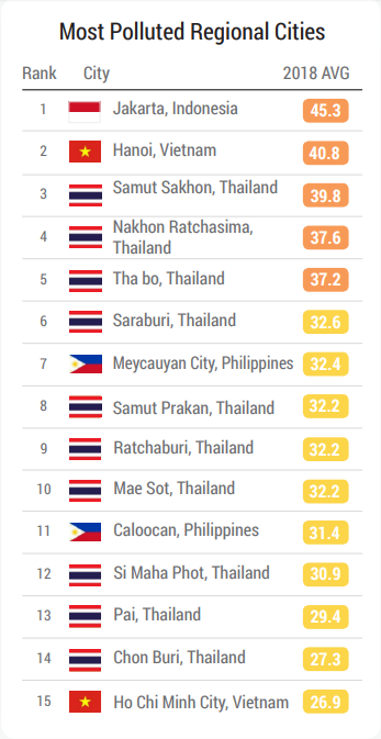 15 thành phố ô nhiễm nhất Đông Nam Á năm 2018, Hà Nội ở vị trí thứ hai và Thành phố Hồ Chí Minh ở vị trí thứ 15. Ảnh chụp màn hình từ Báo cáo chất lượng không khí thế giới năm 2018 của IQAir AirVisual