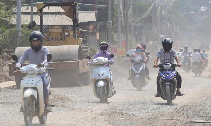 Người đi xe máy đi trên một con đường bụi bặm ở Hà Nội.
