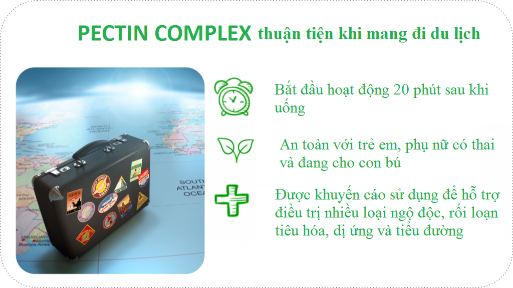 Để có một kỳ nghỉ lành mạnh, an toàn và vui vẻ, hãy mang PECTIN COMPLEX cùng với bạn. Sản phẩm chắc chắn sẽ bảo vệ bạn khỏi những nguy cơ ngộ độc trong kỳ nghỉ của mình!