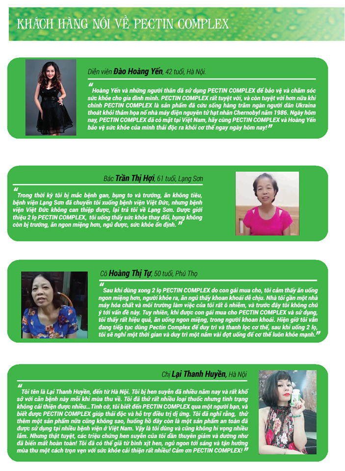 Những phản hồi của khách hàng tại Việt Nam về khả năng loại bỏ độc tố nguy hiểm của PECTIN COMPLEX là rất tích cực và hiệu quả vượt trội, đặc biệt là những người sống ở các thành phố, đô thị đông dân cư phải đối mặt với những vấn đề nghiêm trọng tới sức khỏe là: tiếp xúc với các chất gây ô nhiễm hàng ngày. Mục tiêu của chúng tôi đề ra là không ngừng giúp mọi người bảo vệ sức khỏe và tránh được những rủi ro lâu dài ảnh hưởng tới sức khỏe khi sống trong môi trường ô nhiễm độc hại